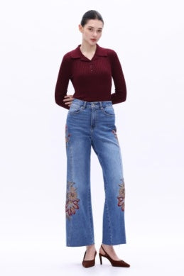 Embroidered wide leg jeans with a high rise fit. Simple denim style with floral patterns for a versatile everyday look.