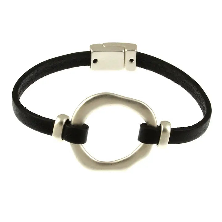 Organic circle shape delicate bracelet with magnetic closure. Lightweight in Vegan leather and traditional leather choices. In gold and silver tone.