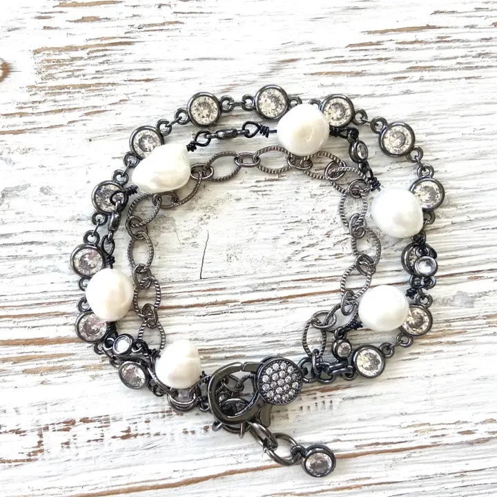 These genuine freshwater bracelets are sure to be your customer favorites. Gunmetal chain clear crystals.