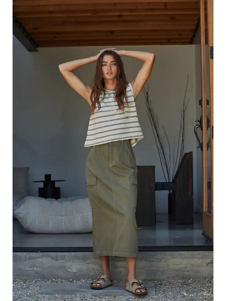 Experience the perfect blend of style and comfort with our Tulum Skirt. This contemporary A-line denim midi skirt features handy side pockets, making it a versatile addition to your spring/summer wardrobe. It's designed with a casual aesthetic that suits the everyday lifestyle.