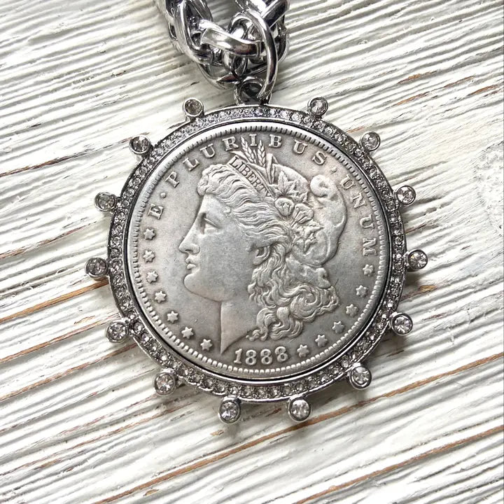 Wow! This French coin necklaces are absolutely stunning. They have a vintage vibe. They are incredible detailed. Sparkly clear crystal bezels. 8mm quality wheat chain. 20”, Coin/medallions are 50”