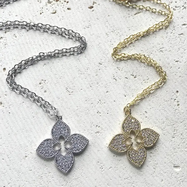 These quatrefoil necklace are so sparkly and trendy. Non tarnishing chains. 19”