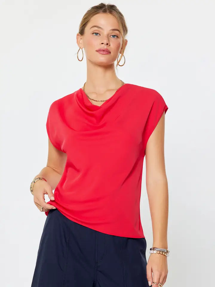 Short-sleeve blouse with a draped cowl neckline and relaxed silhouette